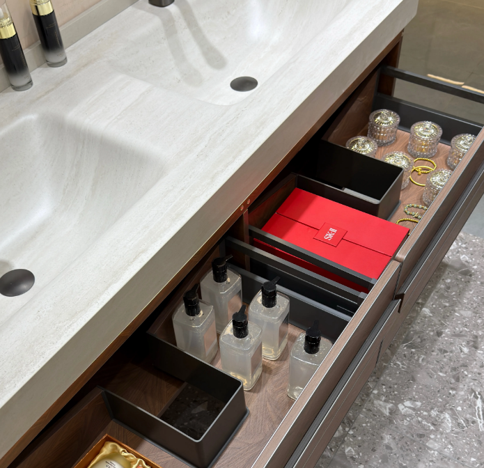 这块拼接板的质感真的很出挑——深棕木纹以几何拼接的方式排布,纹理像细密的织锦般交错,自带高级的秩序感;加上金属线条勾勒边框,冷硬的质感和温润的木色撞出精致感,低调里透着轻奢的贵气。搭配无把手的极简设计,整个面板既保留了自然材质的温度,又通过工艺细节衬出了大气的格调,往卫浴空间一装,瞬间拉高了整体的质感档次。