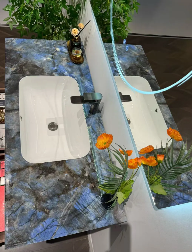 蓝宝石岩板 奢石纹理!独特且有质感;下方搭配木色柜体,提供收纳空间,整体设计简约大气。